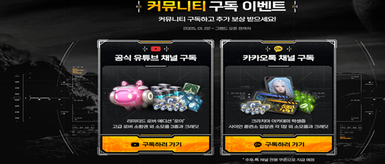 또한, 유튜브 채널구독과 카카오톡 채널 구독시에는 크라치아 아카데미 학생증, 훈련소 입장권 각 1장외 소모품 크레딧을 주고 리미티드 로버 에디션 "로이" 고급 로버 소환권 외 소모품 3종와 크레딧을 주기때문에 번거롭더라도 꼭 해주세요.